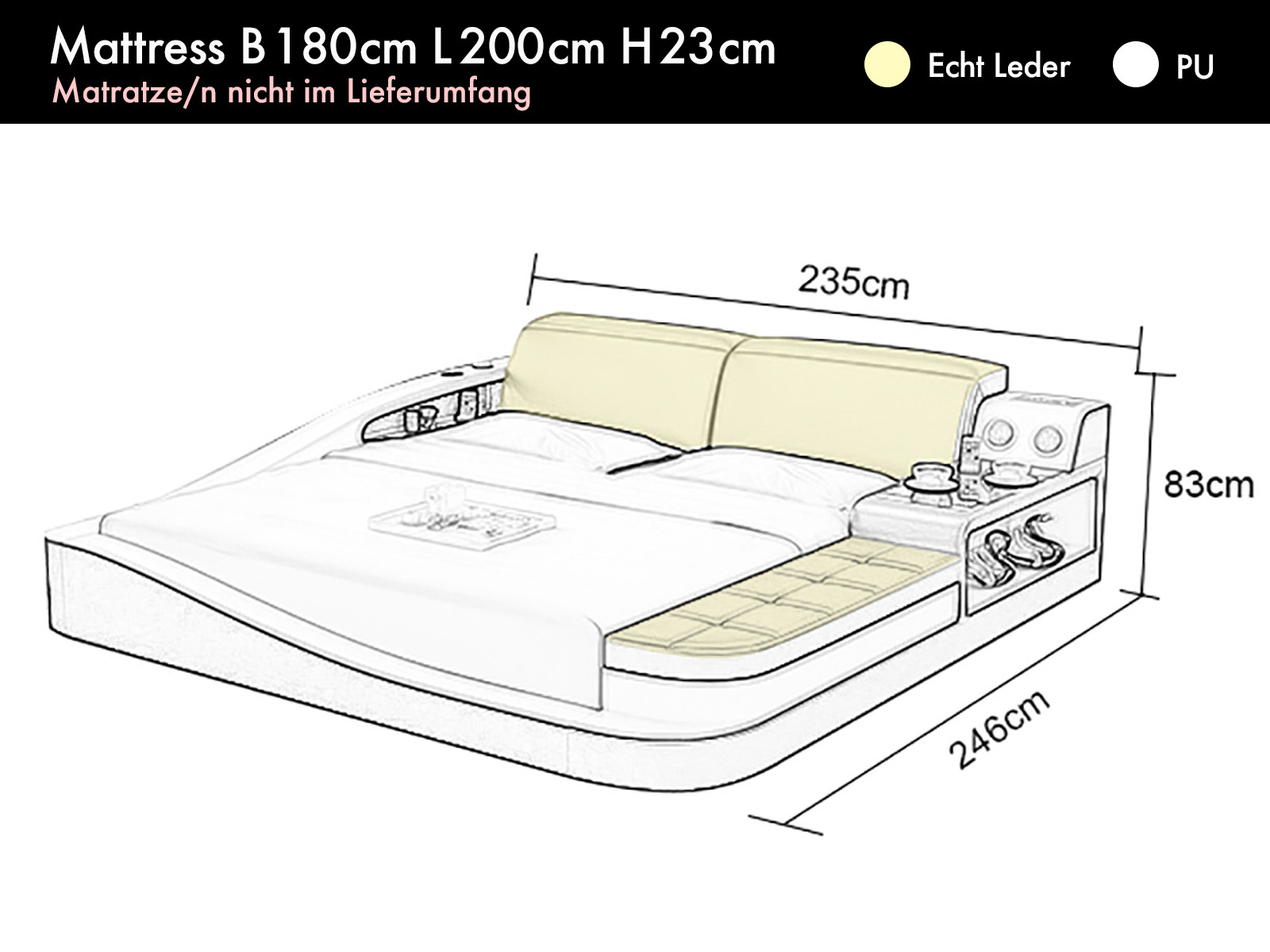 - Alle Teile sind frei im Raum aufstellbar, was bedeutet, dass alle Rücken bezogen sind. | Bitte beachten Sie, dass generell zum Beispiel Leder Betten als solche bezeichnet werden wenn alle gepolsterten Flächen wie Sitzflächen, Rückenflächen also Flächen welche mit unserem Körper in Berührung kommen in Echtleder sind. | Flächen welche zum Beispiel das Gestell verkleiden sind generell und brancheüblich aus Kunstleder.